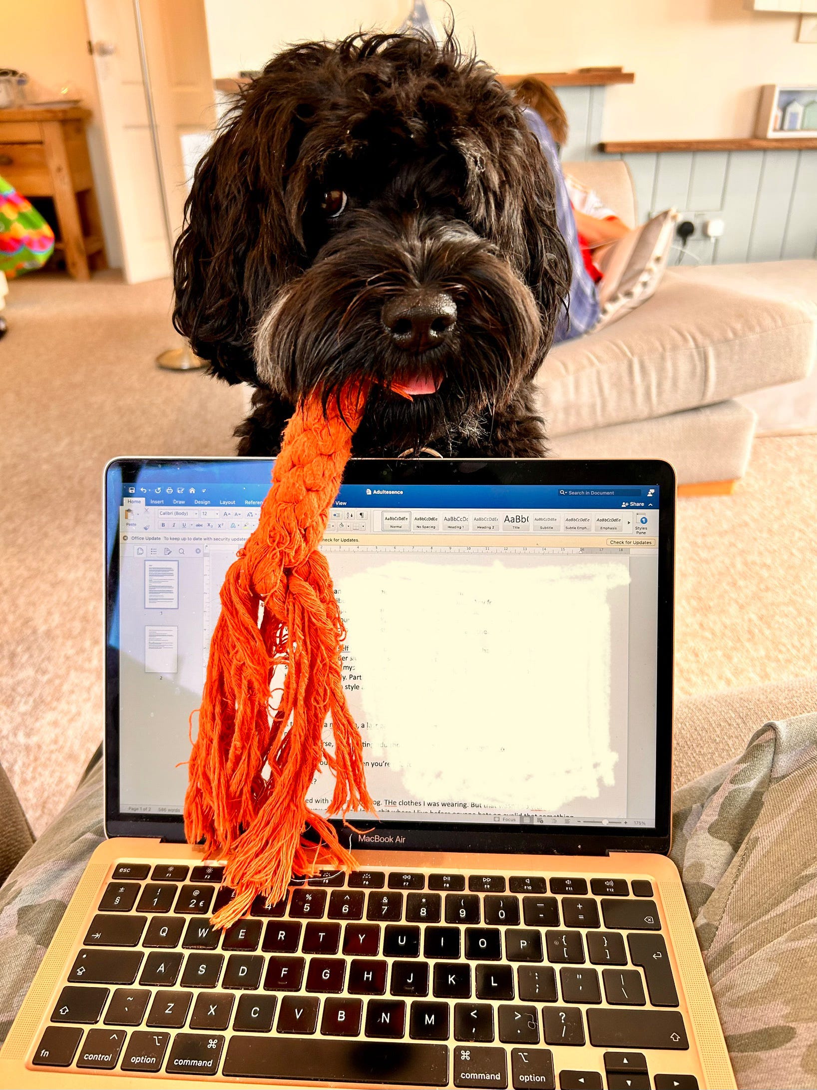 Last week she was wearing the orange suit when, about ten minutes into our walk, her back legs came flying out of it, as they always do. Suddenly she was tearing around the park wearing what was, essentially, a cape. It doesn’t bother her. If anything, it makes her run faster, and makes me smile. Two good reasons to continue with bad-weather fancy dress. It also saves me from washing mud off a dog every morning when I could instead be writing about washing mud off a dog every morning.